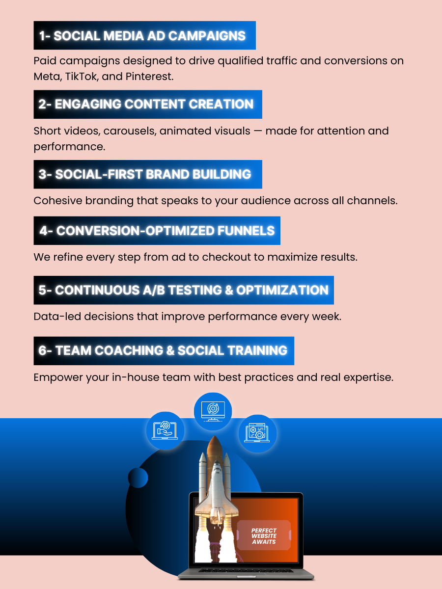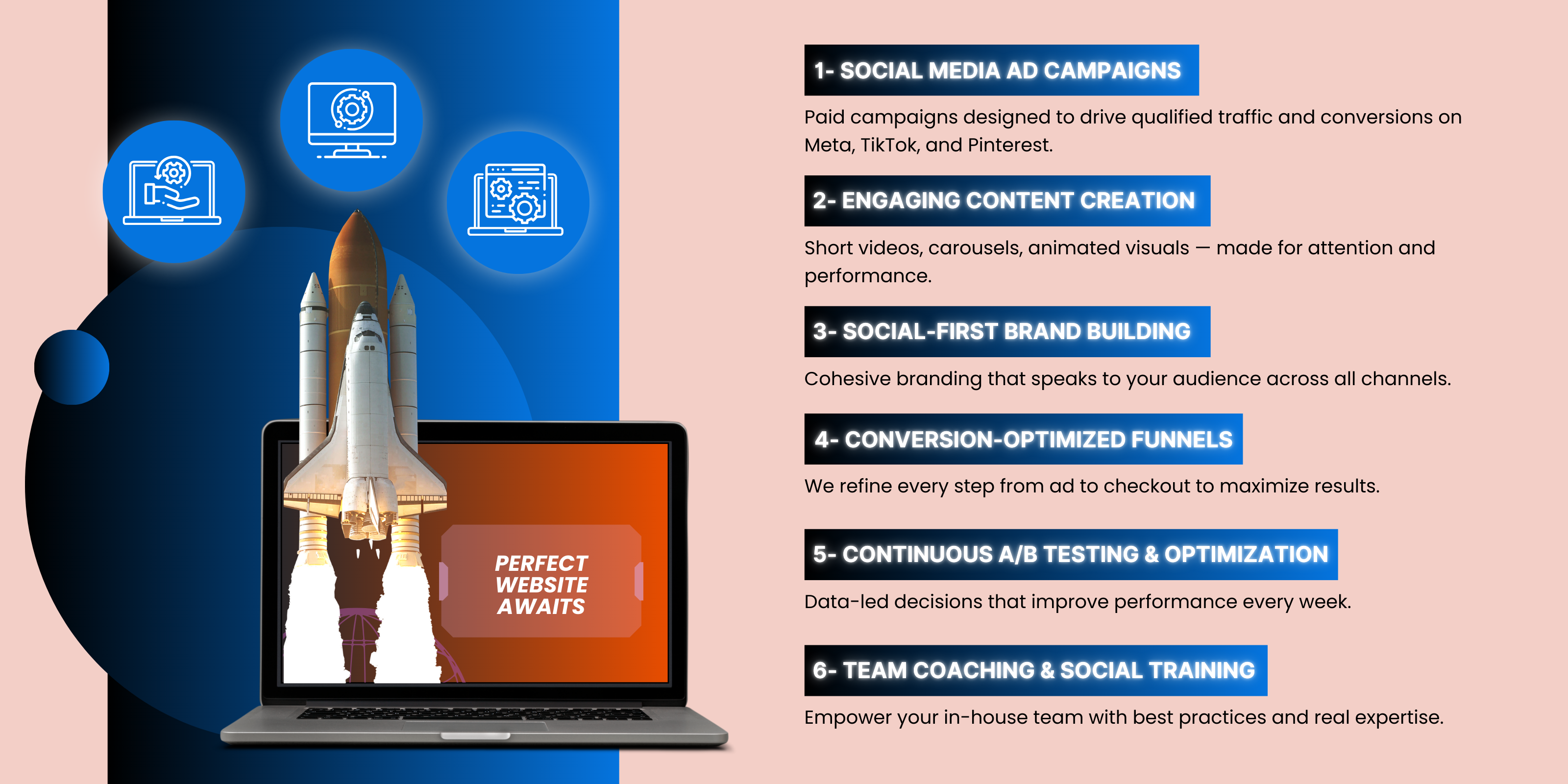 We select the best channels (Meta, TikTok, Pinterest), define clear objectives, and map every step of the funnel.